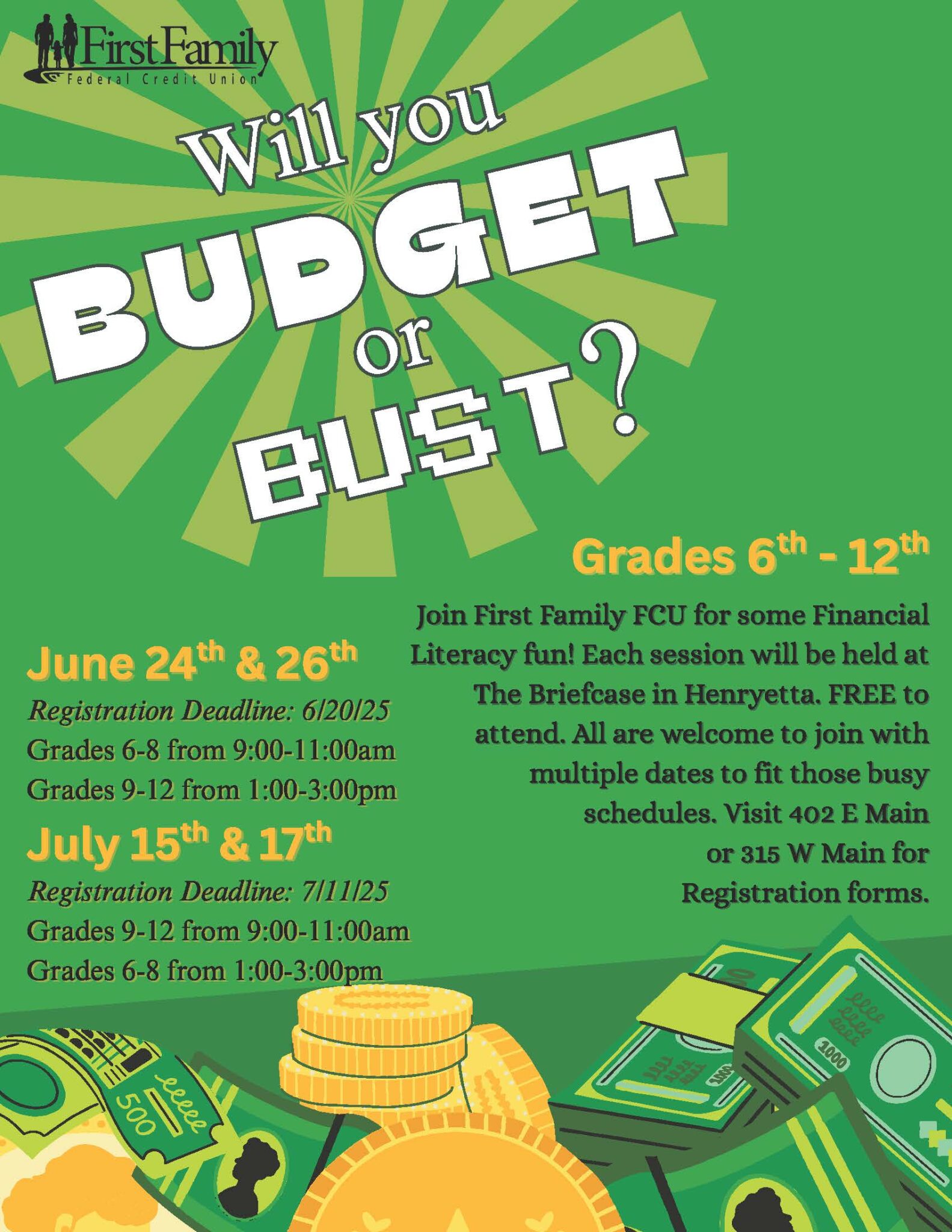 Join First Family FCU for some Financial Literacy fun! Each session will be held at The Briefcase in Henryetta. FREE to attend. All are welcome to join with multiple dates to fit those busy schedules.