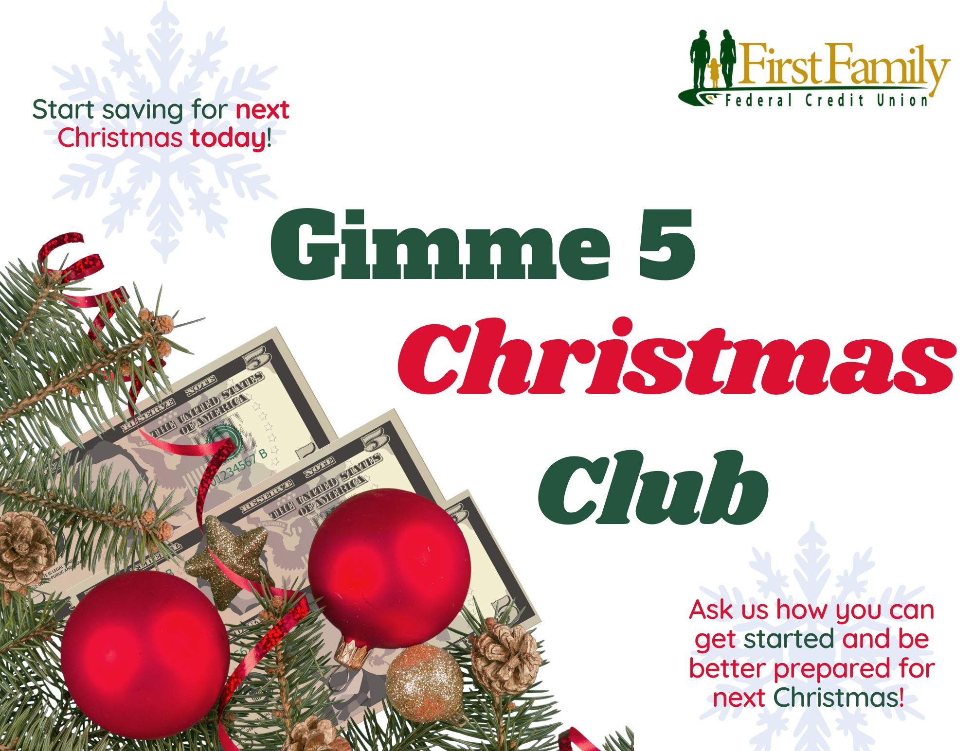 Our “Gimme 5” Christmas Club accounts are open for 2024/2025! Get into the habit of saving all year for Christmas time.
